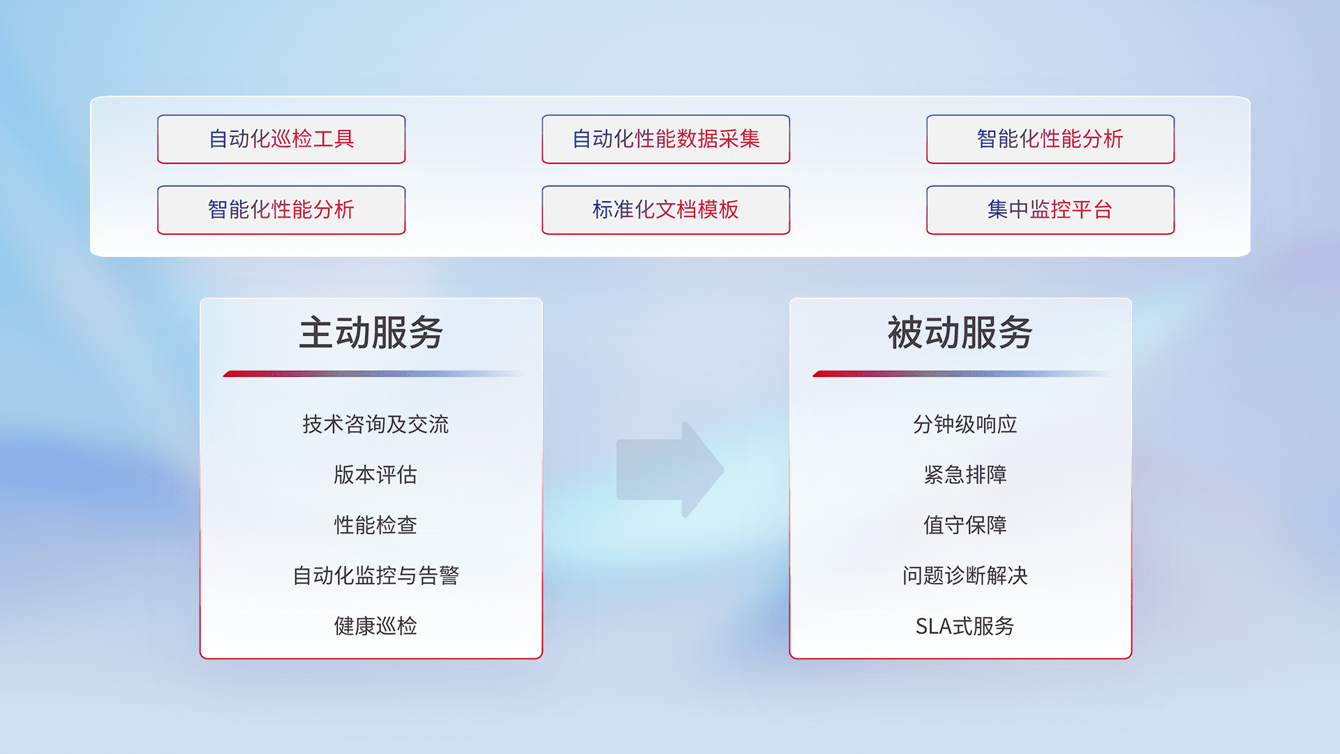 智能化工具和标准化文档,,,保障服务质量,,提供主动服务(包含技术咨询、、版本评估、、、、性能检查、、自动化监控与告警、、、、健康巡检)和被动服务包含(分钟级响应、、、紧急排障、、、、值守保障、、、、问题诊断解决、、、、SLA服务)。。。。